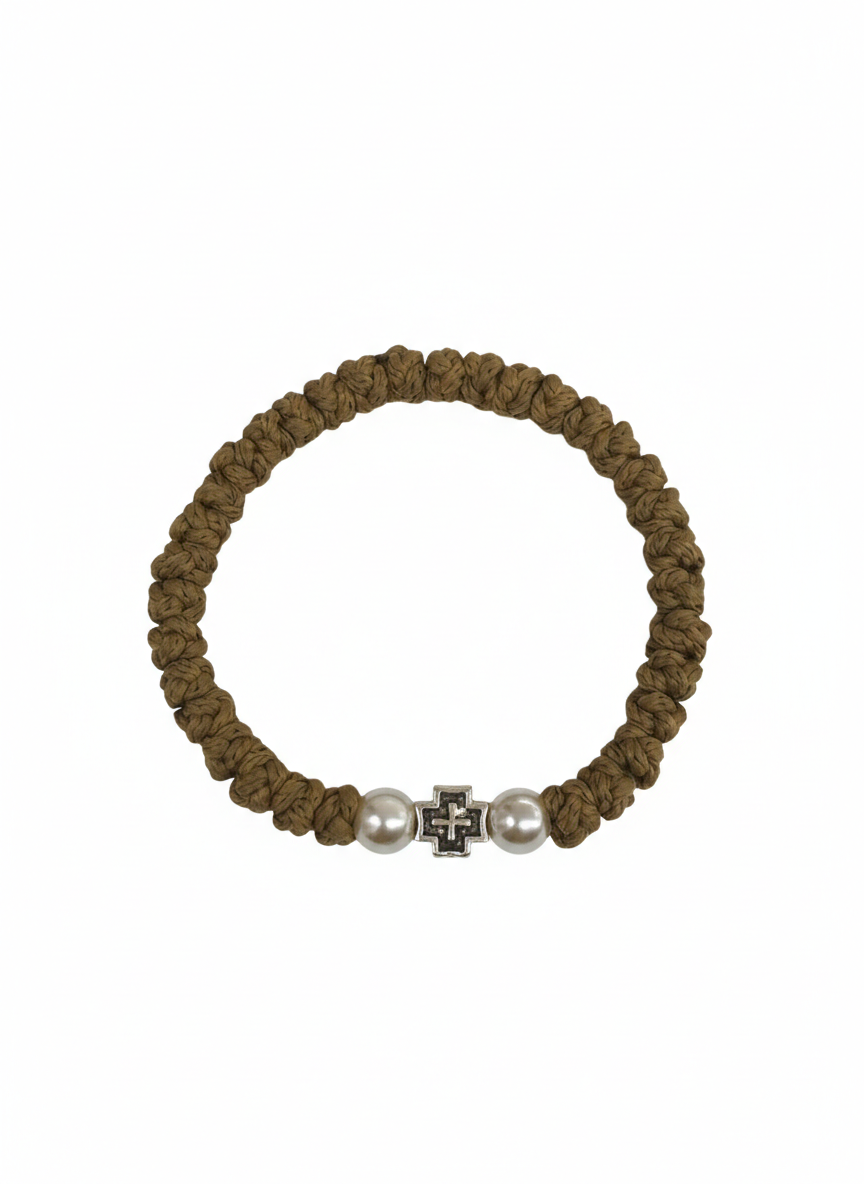 Κατασκευασμένο από συνθετικό νήμα με προσευχή και προσοχή στη λεπτομέρεια, διαθέτει μεταλλικό σταυρό στο κέντρο, ο οποίος πλαισιώνεται από δύο λευκές πέρλες.