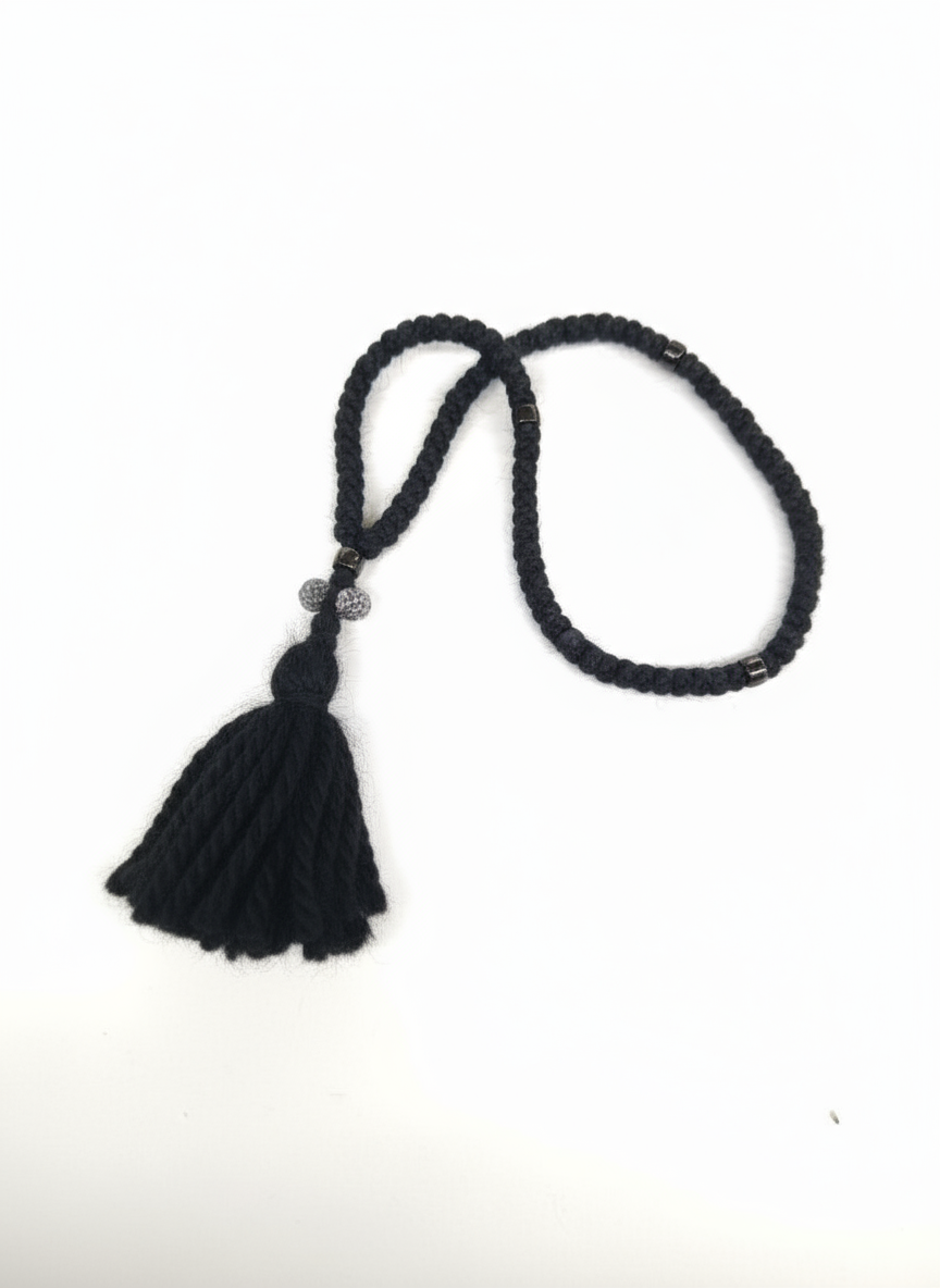 Χειροποίητο κομποσχοίνι πλεγμένο από τις αδελφές της Ιεράς Μονής μας με τρίκλωνο (μεσαίου πάχους) 100% μαλλί μαύρου χρώματος.