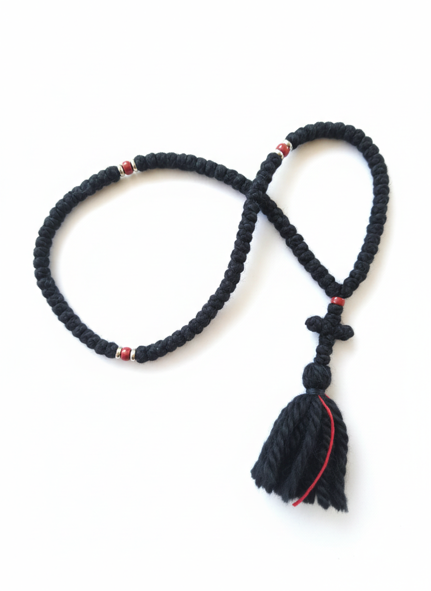 Η πλέξη είναι σφιχτή και ανθεκτική, κατάλληλη για καθημερινή προσευχητική χρήση. Το κομποσκοίνι διακοσμείται με κόκκινες χάντρες και ασημί ροδέλες, στοιχεία που προσφέρουν διακριτική αισθητική χωρίς να αλλοιώνουν τον παραδοσιακό και πνευματικό του χαρακτήρα.
