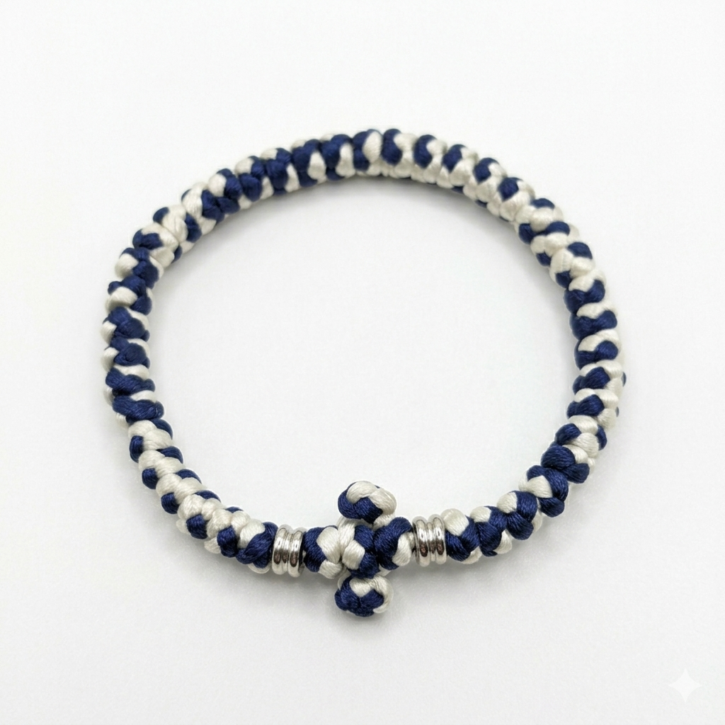 Χειροποίητο δίχρωμο κομποσκοίνι χειρός, εργόχειρο των αδελφών της Ιεράς Μονή μας. Είναι πλεγμένο με συνθετικο νήμα μπλε και άσπρου χρώματος. Στο κέντρο φέρει πλεκτό Σταυρό πλαισιωμένο από μεταλλικές χάντρες.