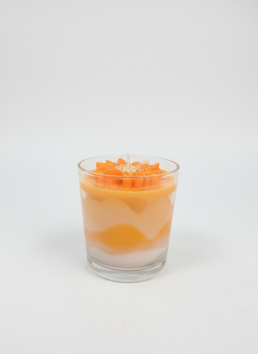 Το κερί βρίσκεται σε γυάλινο ποτήρι και ξεχωρίζει για τη μοναδική του εμφάνιση, με απαλά κύματα από πορτοκαλί και λευκό κερί που ενώνονται  αρμονικά μεταξύ τους.