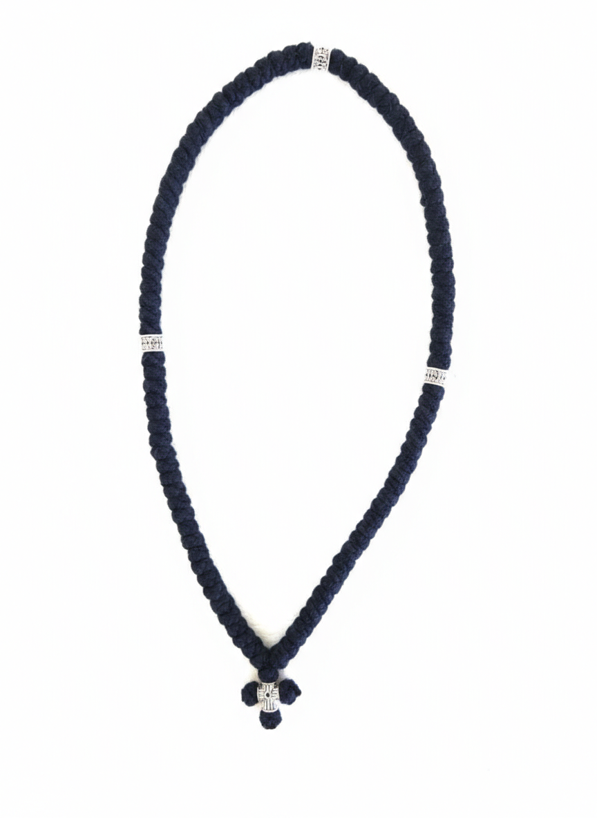 Χειροποίητο κομποσκοίνι από γνήσιο τετράκλωνο μαλλί μαύρου χρώματος, διακοσμημένο με μεταλλικές ροδέλες και μεταλλικό σταυρό στο κλείσιμο. Παραδοσιακό και ανθεκτικό.
