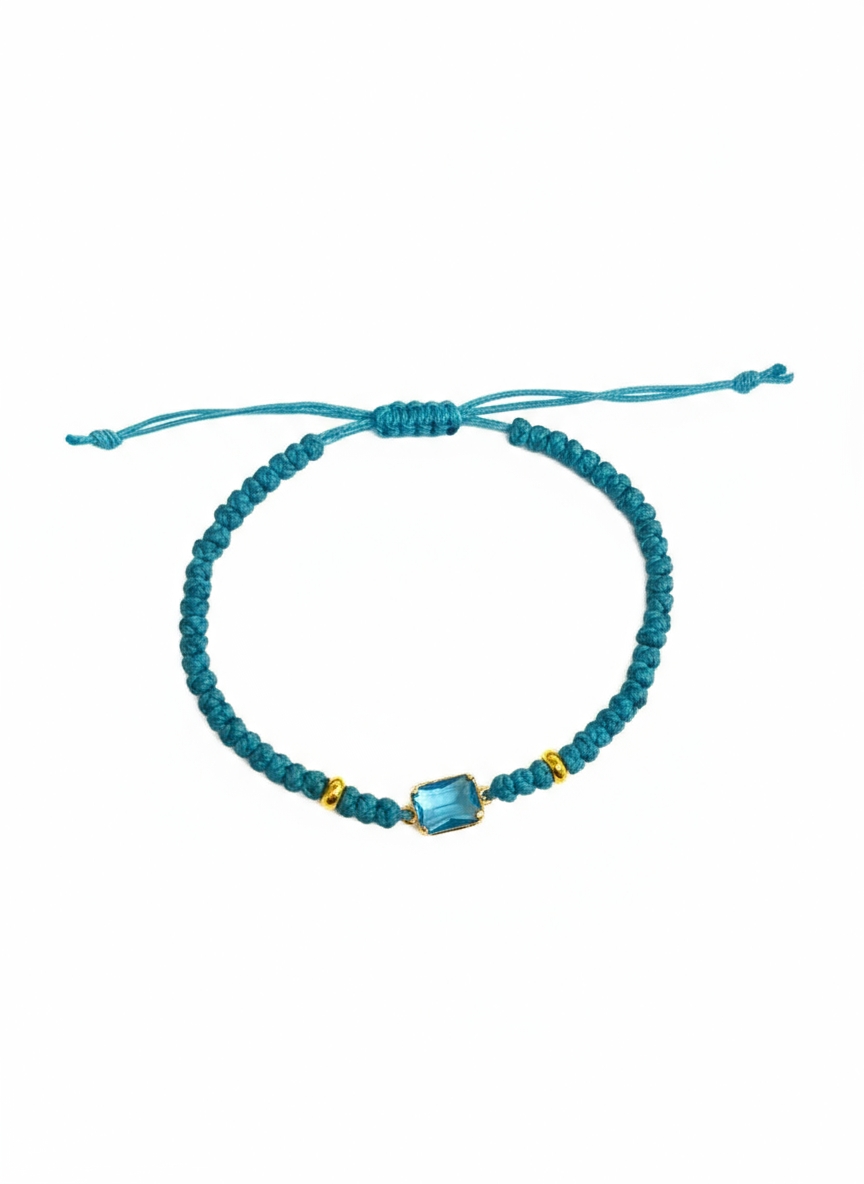 Κατασκευασμένο από γαλάζιο κερωμένο νήμα, διακοσμείται με χρυσές χάντρες και μικρό κρυσταλλάκι, προσφέροντας κομψότητα και μοναδικότητα.