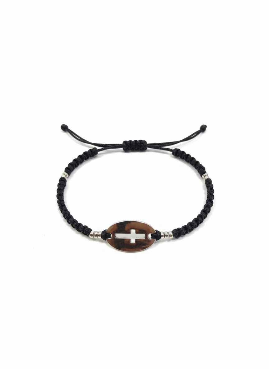 Χειροποίητο μαύρο μακραμέ, φτιαγμένο από ανθεκτική κηροκλωστή. Διακοσμημένο με ασημί χάντρες που προσθέτουν διακριτική λάμψη, το κέντρο δεσπόζει ένα μεταλλικό οβάλ διάτρητο στοιχείο με σταυρό, προσδίδοντας πνευματικό και αισθητικό χαρακτήρα.