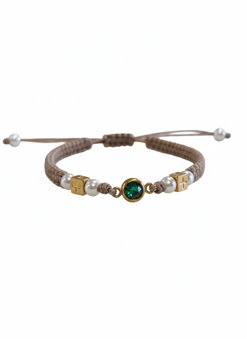 Το κομψό αυτό εργόχειρο διακοσμείται με χάντρες σε χρυσό χρώμα και εκλεπτυσμένες πέρλες, που χαρίζουν διακριτική λάμψη και αρχοντική αισθητική. Στο κέντρο δεσπόζει ένας στρογγυλός πράσινος κρύσταλλος, προσδίδοντας φυσική αρμονία και πνευματικό συμβολισμό.