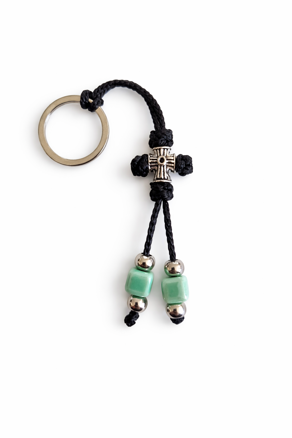 Χειροποίητο μπρελόκ κατασκευασμένο από μαύρο συνθετικό νήμα, πλεγμένο σε σχήμα σταυρού. Στο κέντρο του δεσπόζει μεταλλικός σταυρός, ενώ η σύνθεση ολοκληρώνεται με κεραμικές χάντρες σε ασημί και ασημί χρώμα που προσδίδουν διακριτική κομψότητα.
