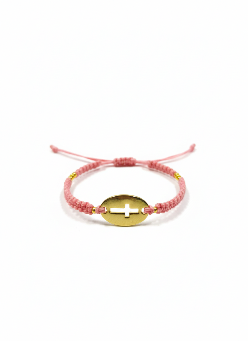 Για την πλέξη του έχει χρησιμοποιηθεί λεπτή, ανθεκτική κηροκλωστή ροζ χρώματος , ενώ στο κέντρο έχει τοποθετηθεί οβάλ μεταλλικό στοιχείο χρυσού χρώματος, διάτρητο σε σχήμα σταυρού και χρυσές χάντρες.